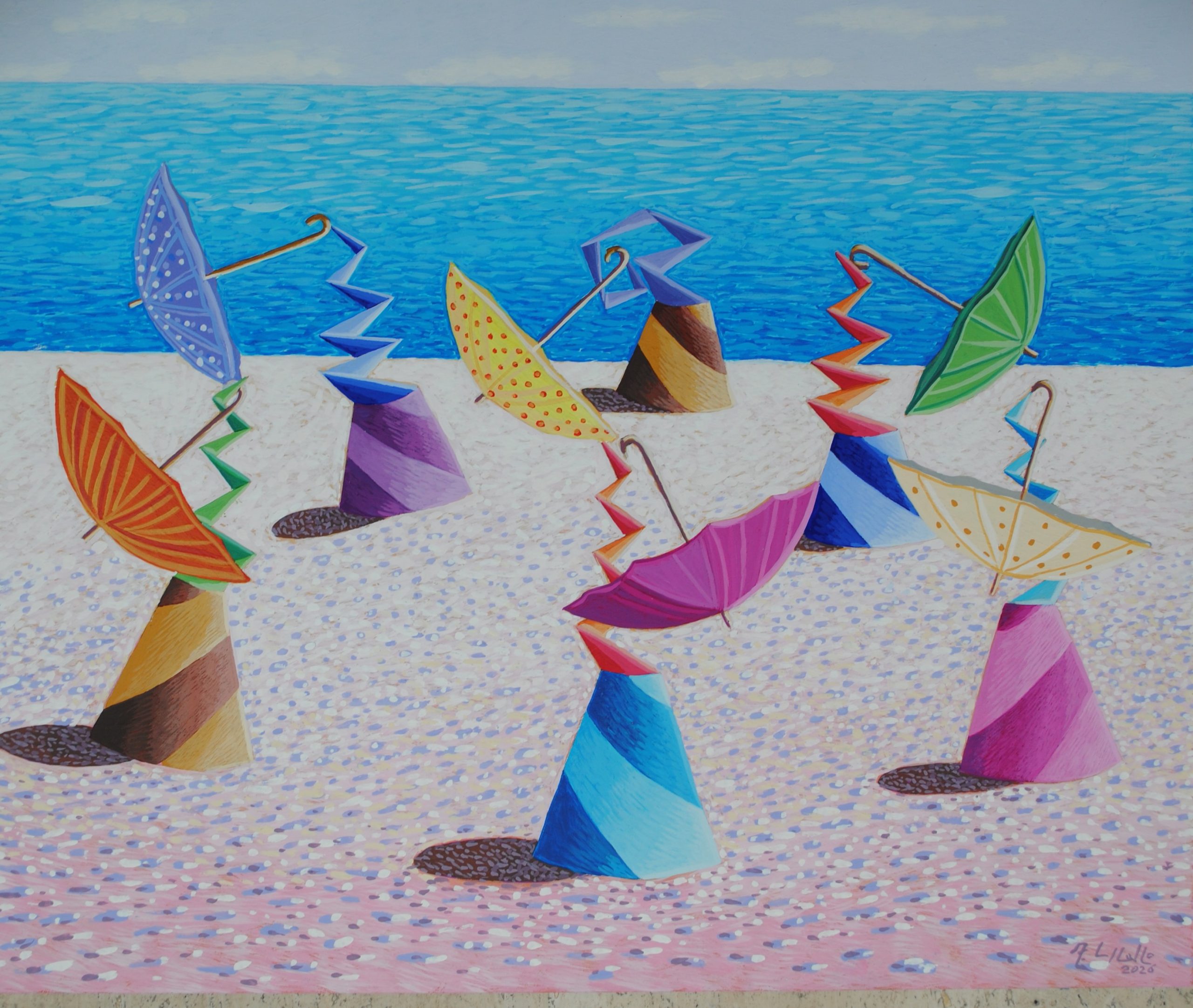 Quest’opera rappresenta un gruppo di forme coniche che danzano con degli ombrelli su una spiaggia di sabbia, vicino ad un mare azzurro.