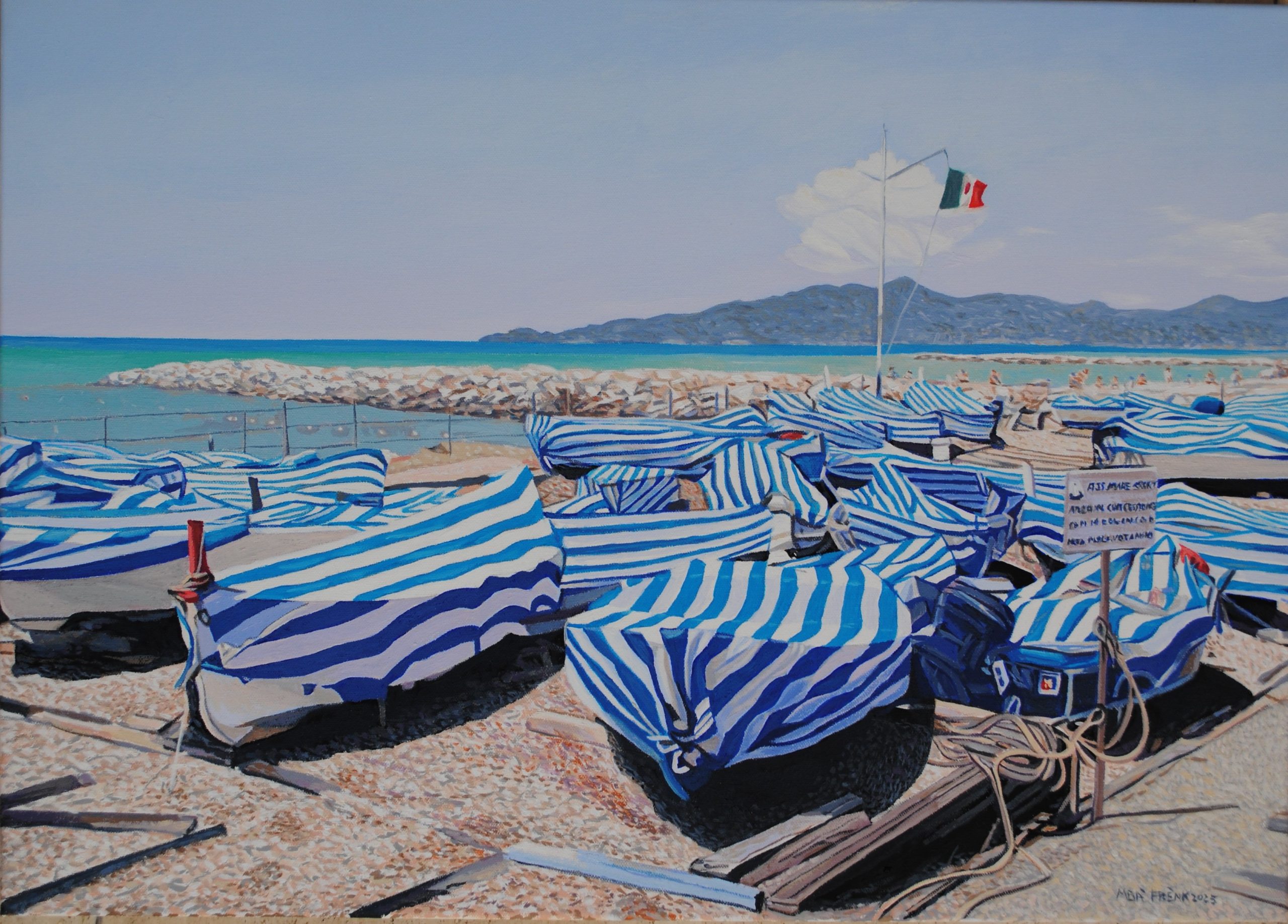 L’opera rappresenta le barche di Chiavari con i suoi caratteristici teli a strisce bianco azzurri sulla battigia