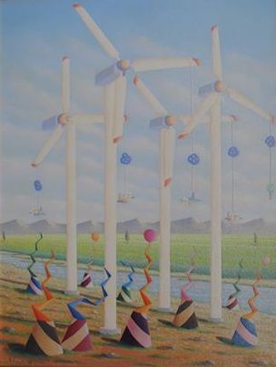 Le pale eoliche, che simboleggiano la nuova energia alternativa, sono inserite in un contesto naturale di prato, fiume, monti e aria pulita, dove un gruppo di forme simboliche ammira i giocattoli pendenti dalle pale. E’ un dipinto con la tecnica della pittura ad olio ed i colori sono tenui e luminosi.